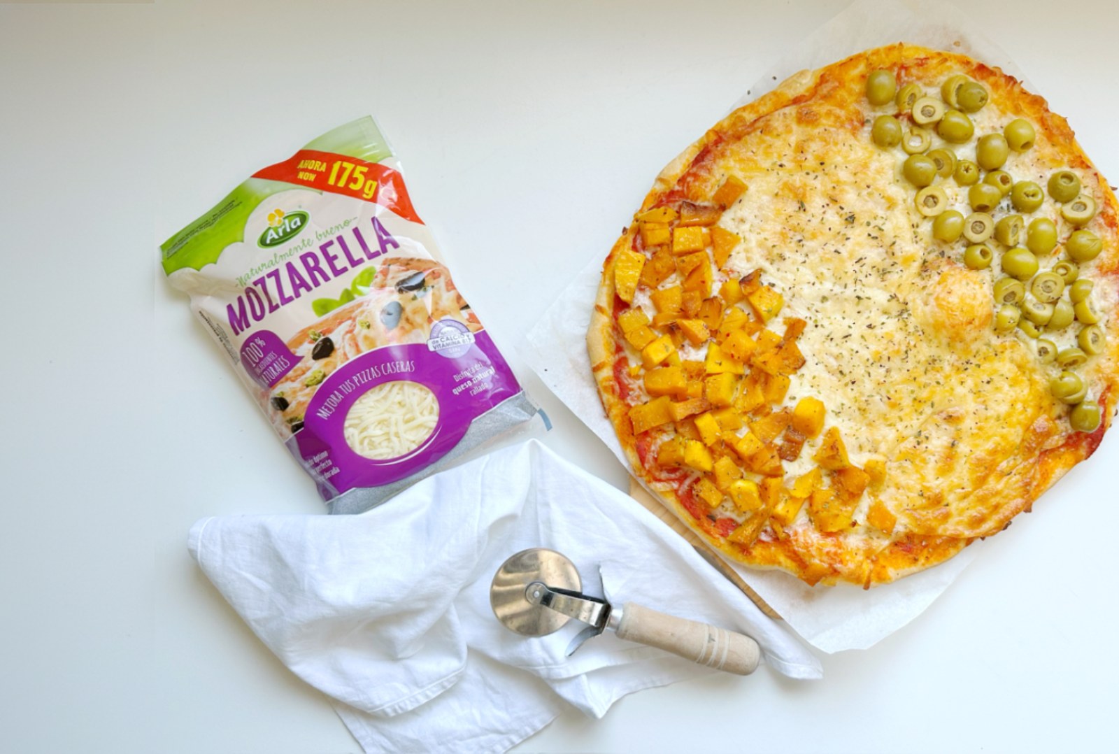 Pizza de calabaza y aceitunas con Arla Mozzarella rallada